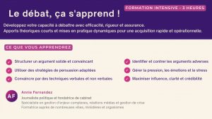 Cette formation intensive de trois heures a pour objectif d’outiller les participantes pour débattre de façon efficace, méthodique et assurée.