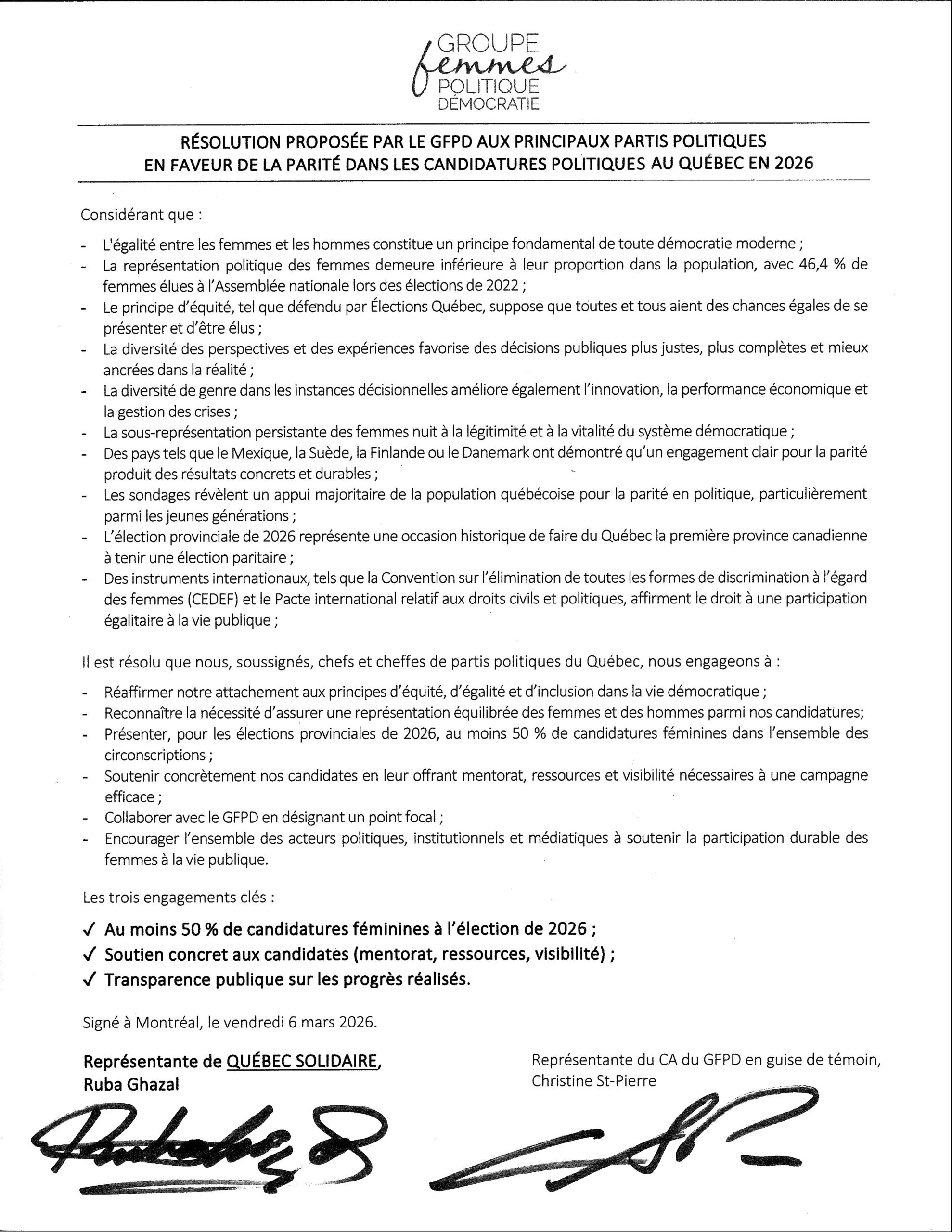 À l’issue de la fin de la période de déclaration des candidatures, la directrice générale du Groupe Femmes, Politique et Démocratie (GFPD), Esther Lapointe, s’est réjouie du fait que le taux de féminisation des candidatures est à nouveau en zone paritaire, soit à 47,1 % pour les 5 principales formations politiques représentées à l’Assemblée nationale. « Avec le record historique de 2018 (47,4 % de candidatures féminines), nous savons dorénavant que les partis politiques peuvent recruter autant de femmes que d’hommes. En 2022, il est temps de légiférer pour obtenir la parité pour de bon tant pour les candidatures qu’au Conseil des ministres! », d’affirmer Esther Lapointe.